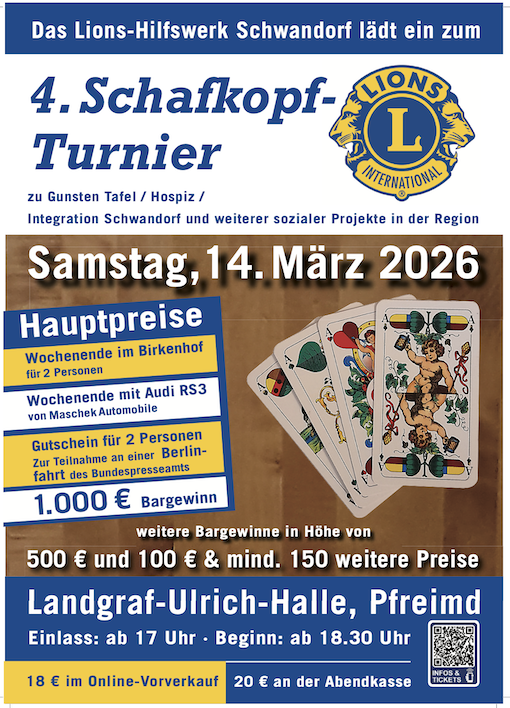 Einlass: 17 Uhr, Beginn: 18 Uhr. Der Einsatz beträgt 12€, Spielmodus "kurzes Blatt". Es gibt Geldpreise (1. Platz: 500€, 2. Platz: 300€, 3. Platz: 150€, 4. Platz 75€) sowie wertvolle Sachpreise zu gewinnen. Für das leibliche Wohl ist gesorgt!