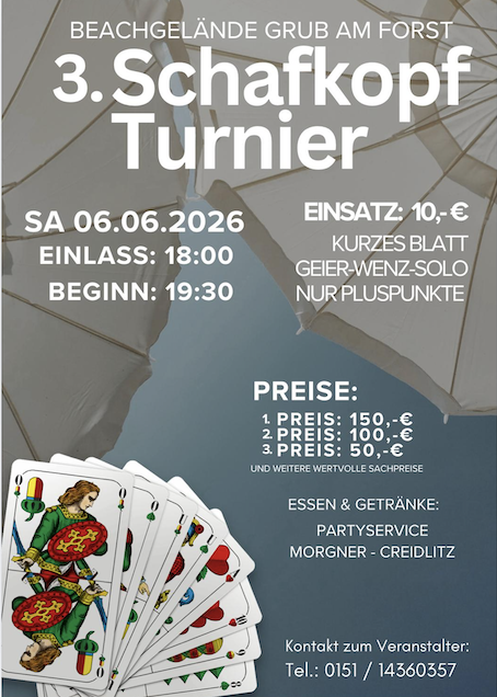 Voranmeldung (so lange Plätze frei sind): bis 01.04.2026 per Email: schafkopfrennen@msf-olching.de am 02.04.2026 ab 17 Uhr telefonisch: 08142 / 6539465 beschränkte Tischanzahl; Jeder Spieler erhält einen Preis; 08142 / 6539465 langes Blatt, mit Solo, Wenz und Farbwenz Plus Punkte Web: https://www.msf-olching.de/